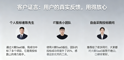 个人投标者陈先生:“以前用免费工具总漏检,自从用火眼 SaaS 版,半年投了 8 个项目,没一次因重复率问题废标,关键是免安装,出差带着平板就能查,太方便了!”