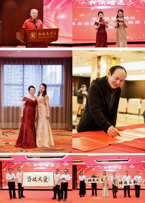 团拜会最后环节——书画家为联盟赠送墨宝。首先,赠送的是由咨政联盟副秘书长、扶绥县野生古茶树保护协会会长黄文伟代表罗殿龙院长上台,为咨政联盟展示罗老院长惠赠的墨宝——《咨政大爱》。赵晓阳副主席接过《咨政大爱》的大幅墨宝。罗殿龙老院长不仅是一位德高望重的领导,更是一位功底深厚的书法家。这幅作品笔力雄健、气韵浑厚,饱含着对我们咨政联盟的深厚情谊与美好祝福。这沉甸甸的墨宝,是我们咨政联盟收到的无价之宝。